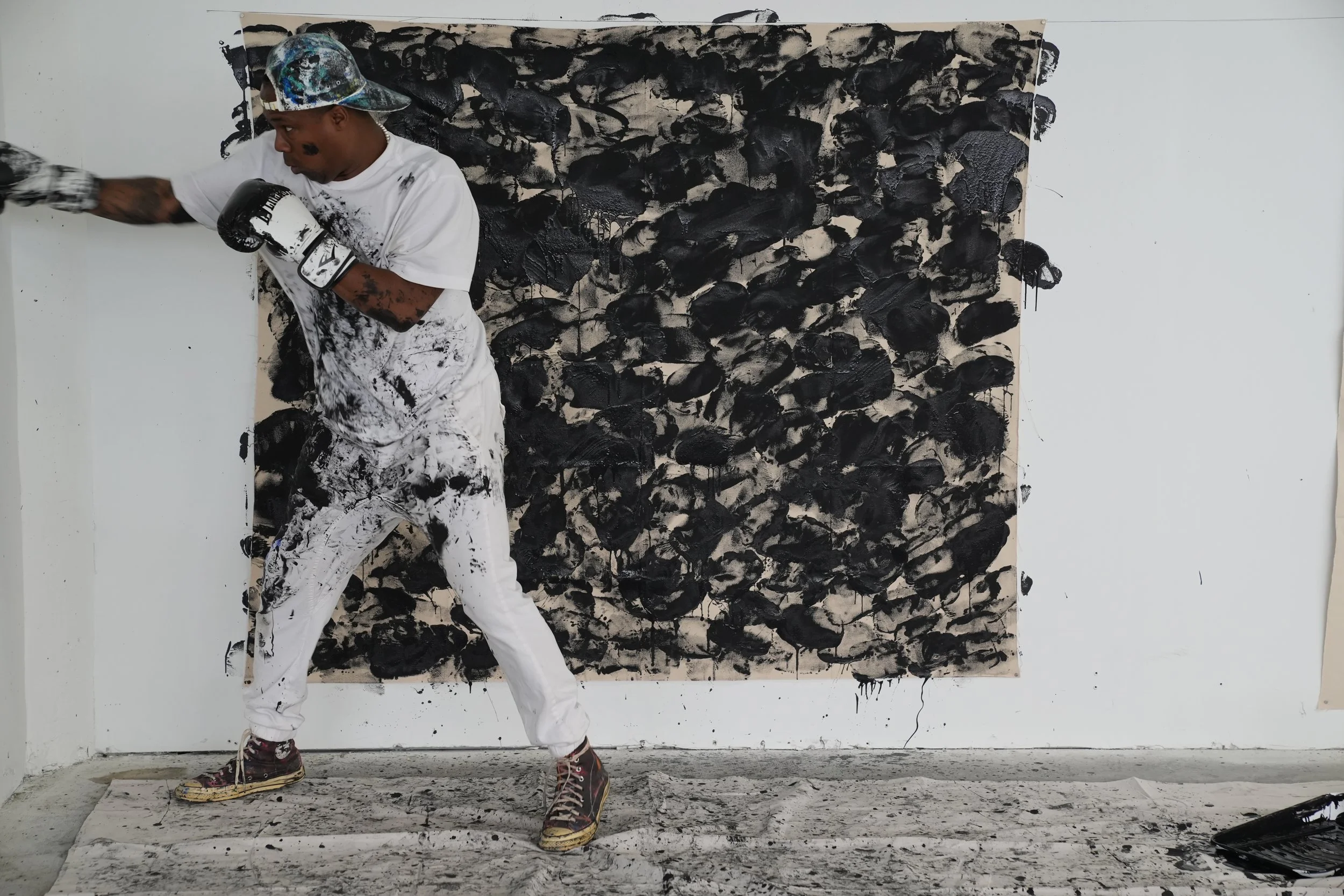Robinson’s artistic journey began with poetry, an origin that continues to shape his visual language. Rhythm, gesture, and improvisation remain central to his process, whether he is applying paint directly with his hands, constructing sculptural forms, or creating immersive installations. His work is often physical and performative in nature, emphasizing the act of making as an extension of lived experience.